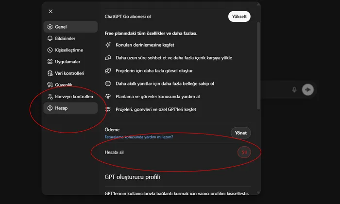 Bazı kullanıcılar ayarlar bölümünde hesap silme seçeneğini göremeyebilir. Bu durumda OpenAI destek ekibi üzerinden hesap silme talebi oluşturabilirsiniz.
