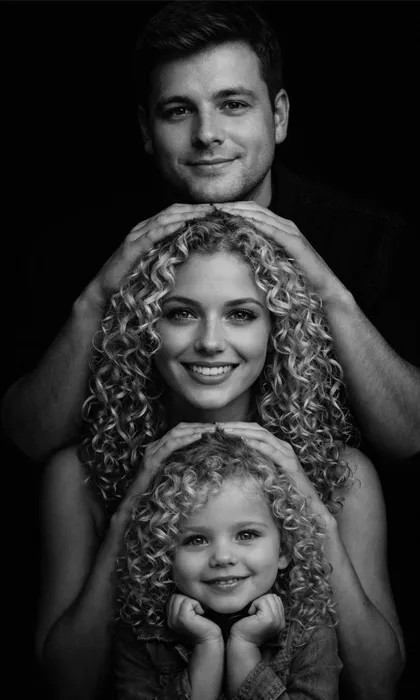 Dramatic, studio-style, black and white portrait photograph of a family of three, meticulously arranged in a creative vertical stacking formation. The composition must remain strictly faithful to the physical features (face, hair type, jawline, lips, eye structure) of the people in the reference photographs. The entire scene (clothing, background) is deep black. At the top, the father stands, looking directly into the camera with clear, open eyes and a subtle smile; his hands are gently resting on the mother's head below him. Directly beneath him, the mother sits, smiling warmly, her hands placed softly on the child's head below. At the bottom, the child is seated, hands close to their chin, looking directly at the camera with a sweet, endearing expression. 16:9 vertical aspect ratio, 8k high quality, dramatic lighting.1. Prompt ile Hazırlanan Örnek Görseller