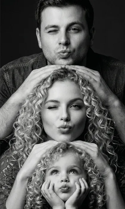 Using the uploaded family photo as reference, create a studio black-and-white portrait of the same family arranged in a vertical stacked composition. The father stands at the back, gently resting his hands on the mother's head; the mother places her hands softly on the child's head; the two child sits at the bottom resting their chin on their hands. All four have playful expressions, subtle kissy lips, with a gentle wink from the parents. Soft, dramatic studio lighting with smooth falloff, deep shadows, and a dark seamless background. High-contrast monochrome photography, professional family portrait style, sharp focus on faces, centered and symmetrical composition, 85mm lens look, shallow depth of field, ultra-detailed skin texture, 16:9 vertical, clean minimal studio setup, timeless and elegant.2. Prompt ile Hazırlanan Örnek Görseller
